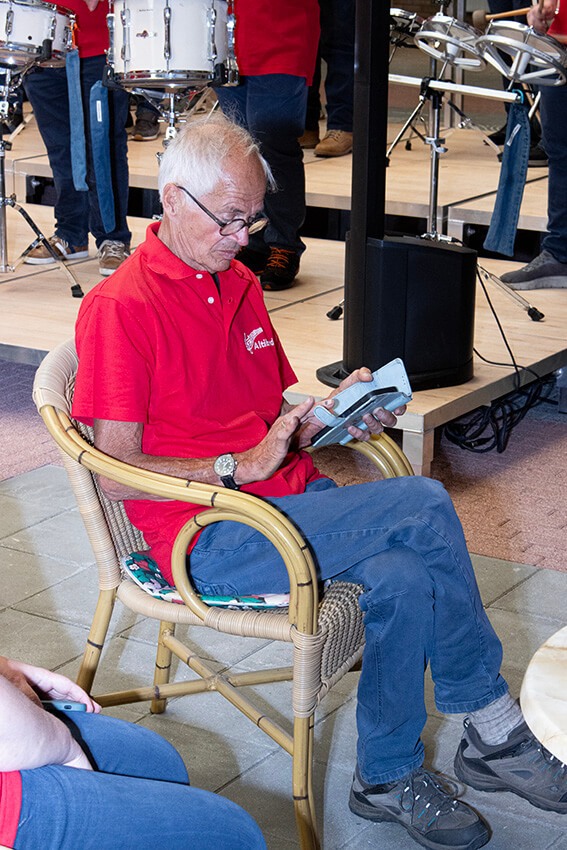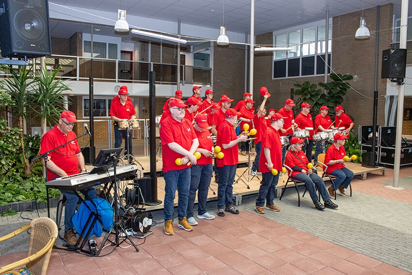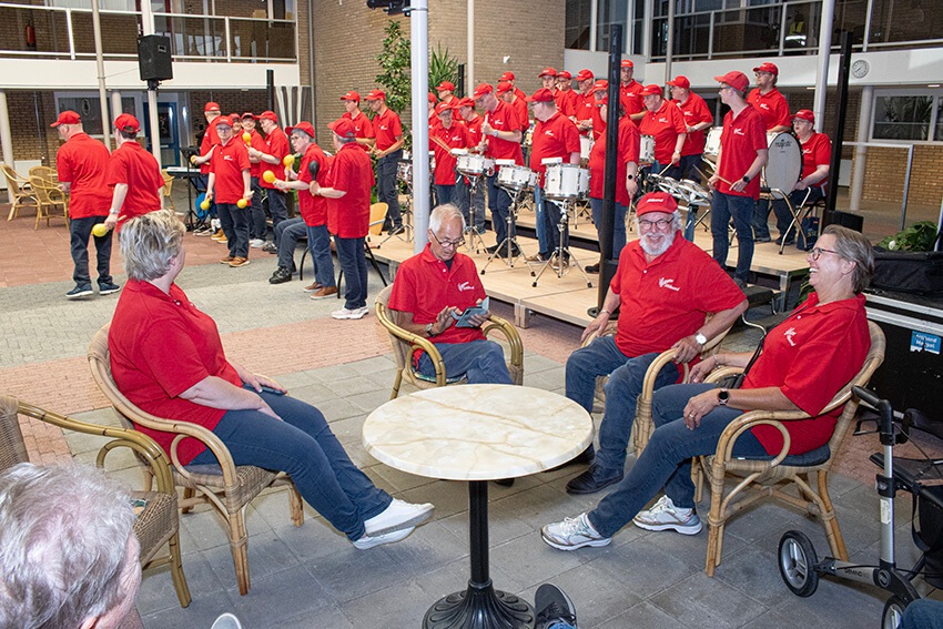 Wij helpen de leden het podium op, omtrent voorkomen dat er iemand uitglijdt of op een andere manier zou kunnen vallen. Opmerkelijk, niemand van de leden onderuit maar Marten maakt een buikschuiver en belandt in een weelderige plantenbak. Liep goed af gelukkig. Bert krijgt de zaal mee en het hoogtepunt voor de zaal en ook voor ons, een groot aantal Nederlandstalige melodietjes, die meegezongen worden.