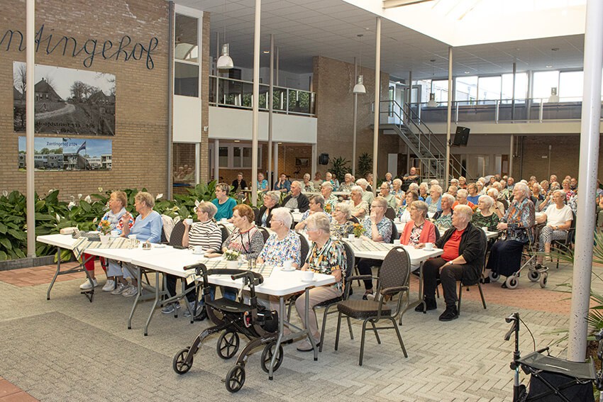 Eén echt podium stond klaar en een compliment voor de gezellig ingerichte zaal. Bloemen op elke tafel en voor onze leden staat de koffie en fris klaar. Stille hoop van Marten en Frans of we met dit mooie weer een buitenoptreden tegemoet konden zien, zat er niet in. Een volle zaal en Bert Koster heeft er zin in. Glunderkoppie, want hij is bekend in Zuidwolde.
